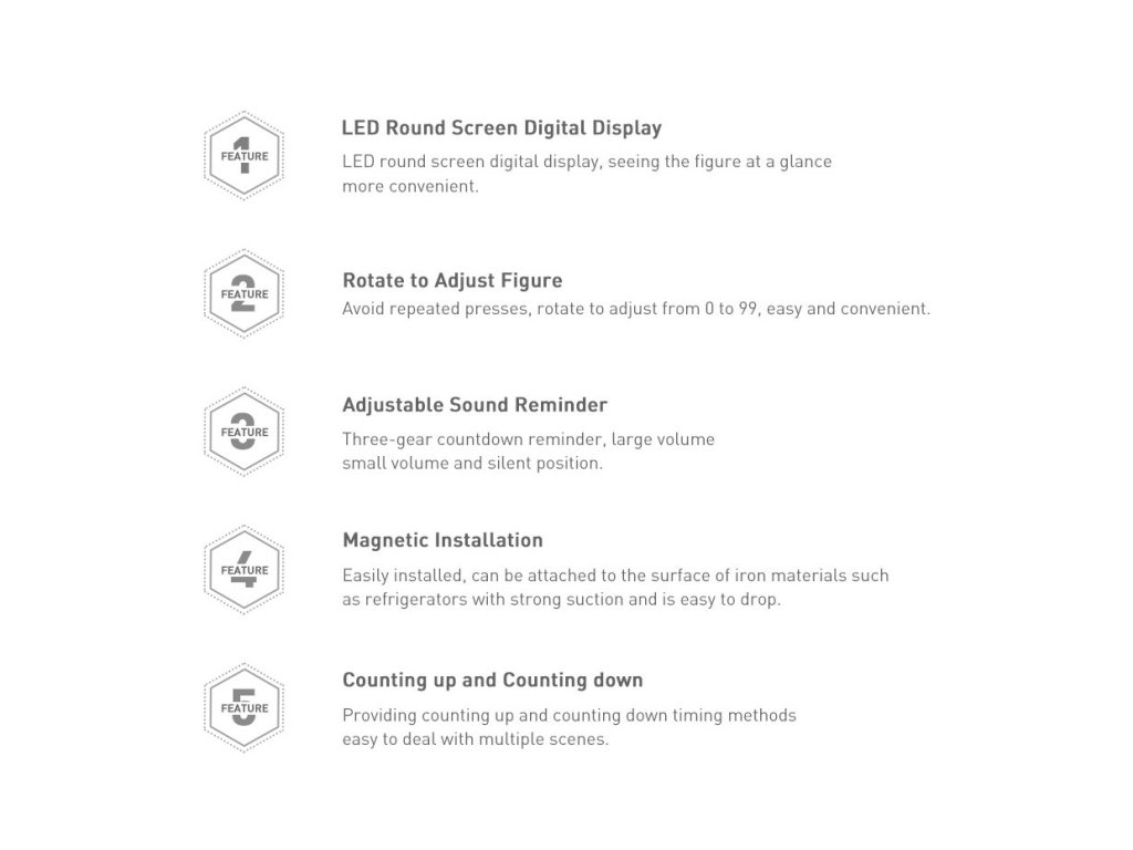 Časovač se nastavuje jednoduše otáčením jeho pouzdra. Tímto způsobem lze odpočítávat až 99 minut a 55 sekund. Zvuk odpočítávání lze nastavit na 3 úrovně zvuku budíku: od vypnuto až do 90 db. Jednoduchý přepínač hlasitosti je umístěn na zadní straně pouzdra. Vestavěné magnety umožňují pohodlnou montáž a přemístění stopek na libovolné (kovové) místo.