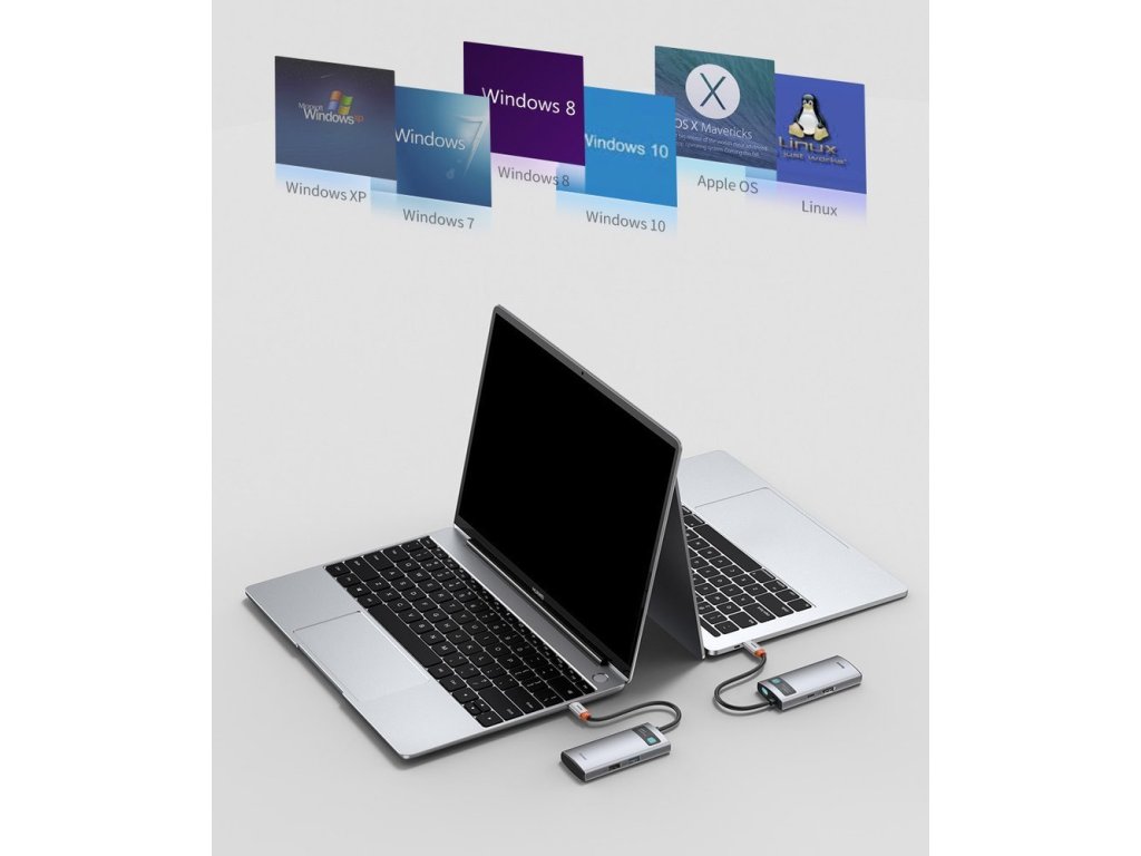 Notebooky a tradiční počítače jsou jen některá ze zařízení, která tento adaptér podporuje. Stejně snadno k němu můžete připojit i svůj telefon nebo tablet. Tento hub promění Vaše mobilní zařízení v efektivní pracovní stanici a umožní vám pracovat jako na skutečném počítači. Připojte myš, klávesnici a externí disk. A pokud má telefon tuto funkci, můžete připojit i monitor. Hub je kompatibilní s mnoha operačními systémy - bez ohledu na to, na jakém systému pracujete, hub s ním bude pracovat ihned po připojení. Režim Plug&Play je zárukou, že nejsou potřeba žádné další ovladače. Je připraven ihned po vybalení z krabice a snadno se používá.