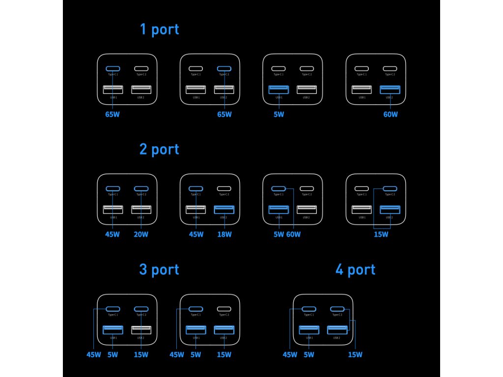 - Až čtyři porty pro nabíjení: USB Typ C1, Typ C2, USB 1 a USB 2