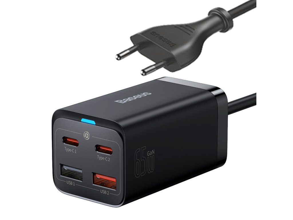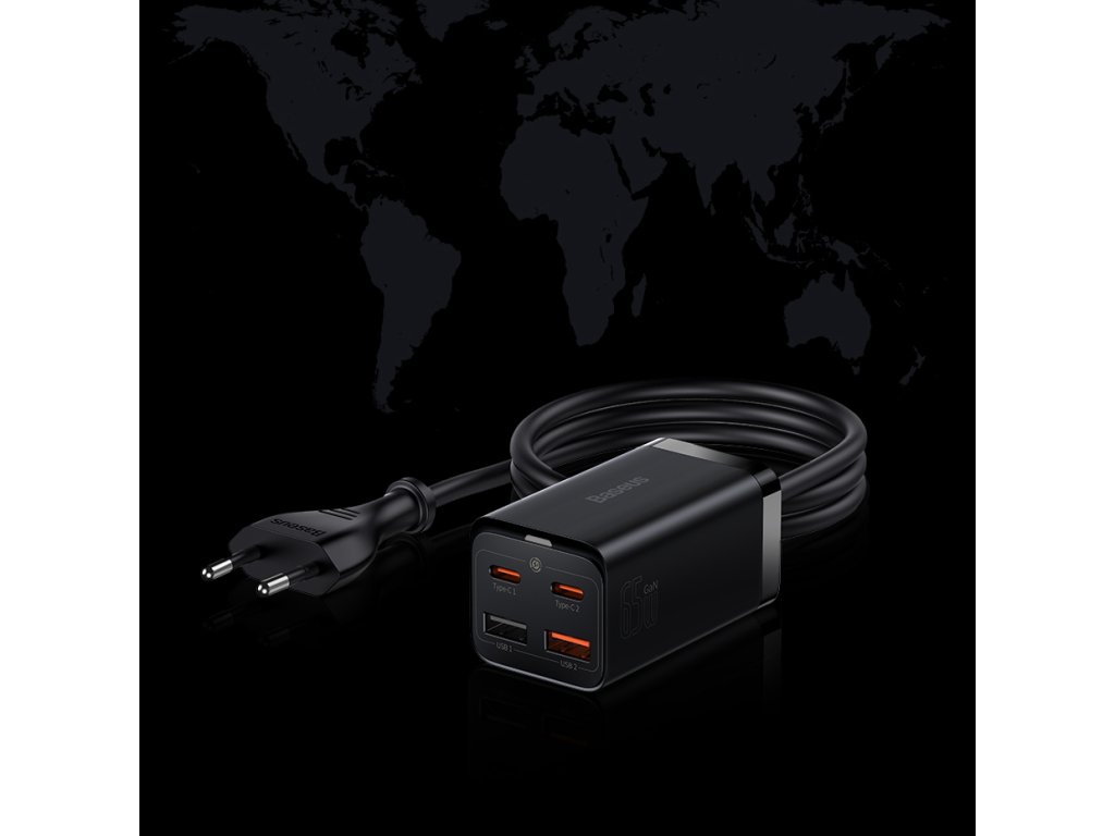 Baseus GaN3 Pro GaN rychlonabíječka 2 x USB typu C / 2 x USB 65W PD, QC4.0+, AFC, PPS + USB typu C - kabel USB typu C 1m černý (CCGP040101)