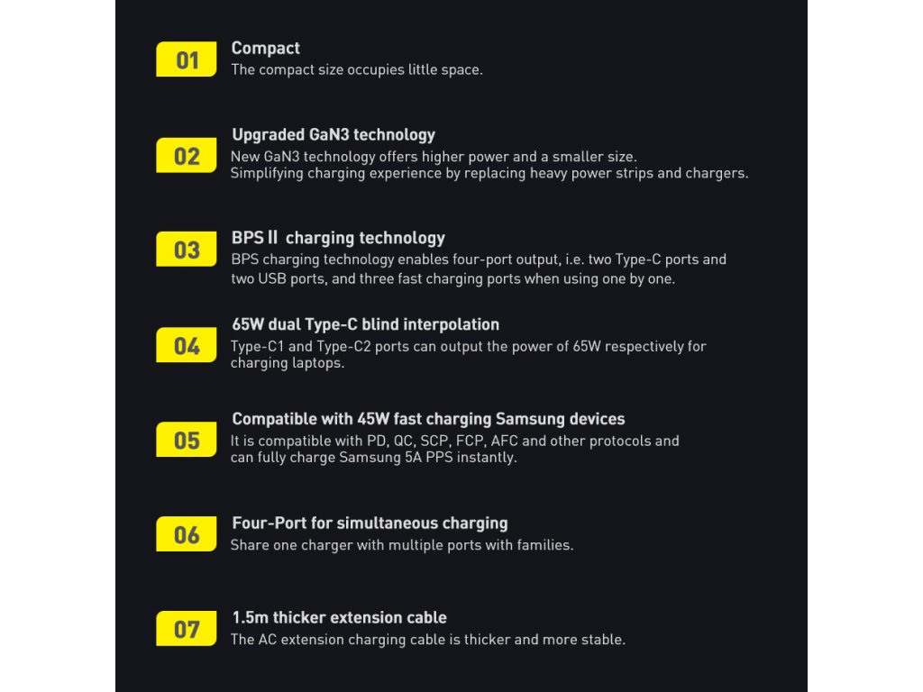 Baseus se zaměřuje na vysokou kvalitu a používání pokročilých technologií, jako je GaN (Gallium Nitride) technologie, která umožňuje vytvářet výkonné a efektivní nabíječky. Díky důrazu na detail a kvalitní materiály získaly produkty Baseus mnoho mezinárodních ocenění za design a funkčnost.