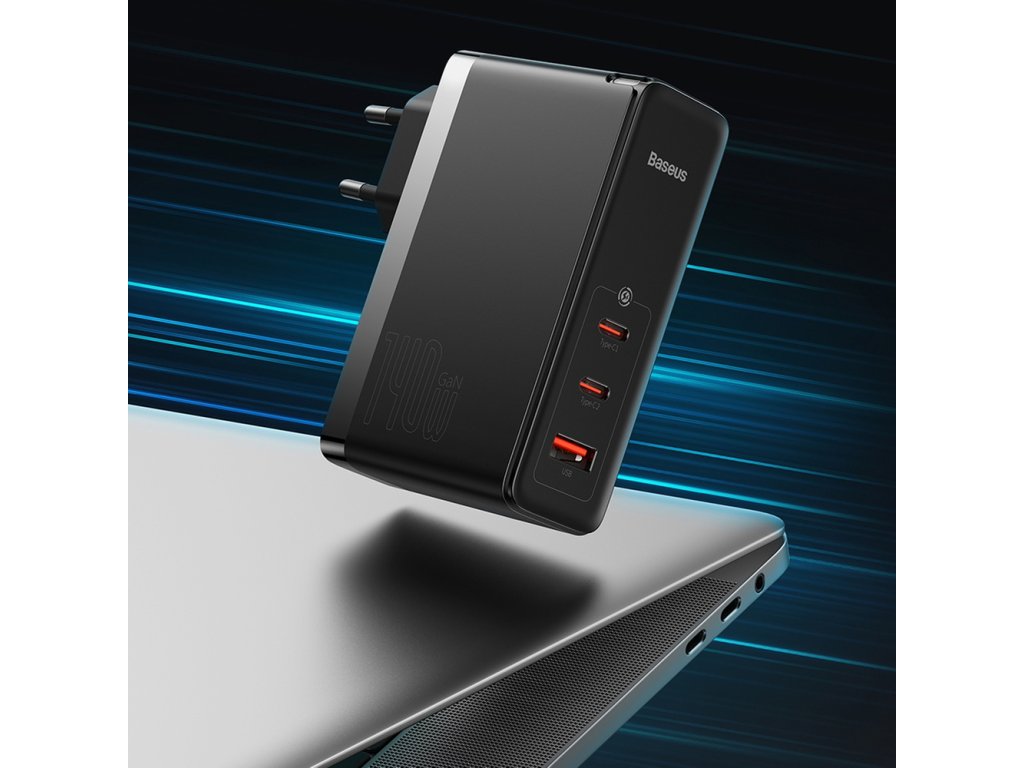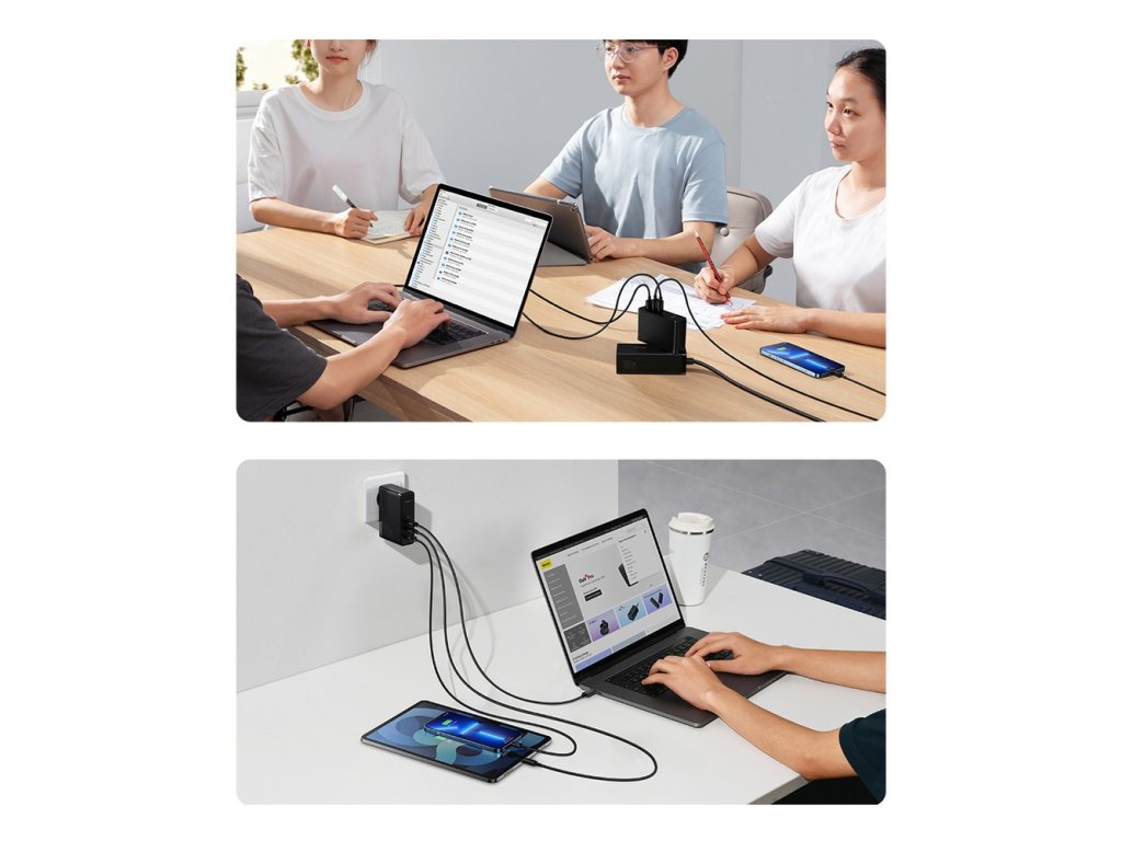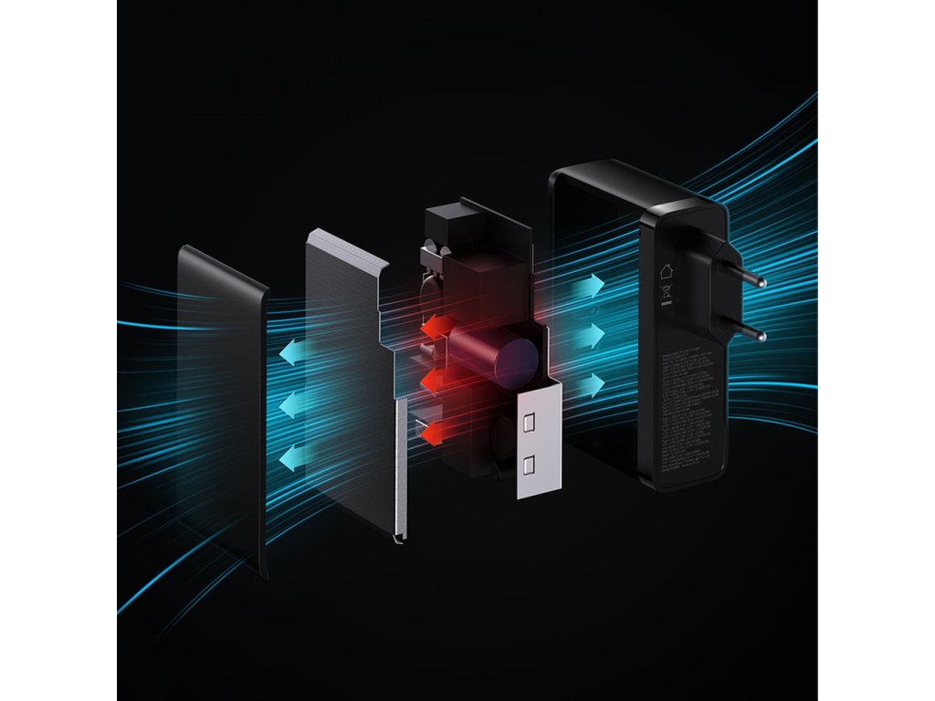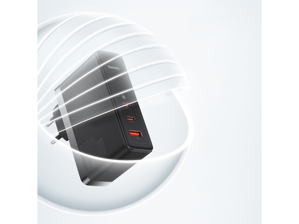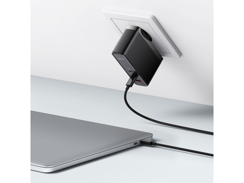 Z powodzeniem sprawdzi się do ładowania laptopów ze złączem USB Typ C (100W). Jednocześnie możliwe jest ładowanie trzech urządzeń. Użytkownik nie musi przy tym obawiać się zwarć czy przepięć. Technologia BPS (baseus power split) umożliwia inteligentny podział prądu wyjściowego przy obsłudze kilku sprzętów. Dla poprawienia komfortu korzystania z ładowarki Baseus GaN producent zastosował aż 6 zabezpieczeń, w tym przed przegrzaniem, przepięciem, wysokim napięciem, przeciążeniem, nadmiernym poborem mocy oraz elektrostatyką.