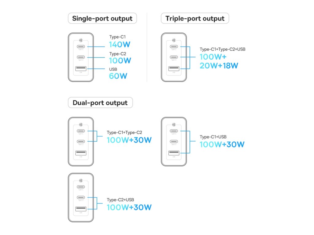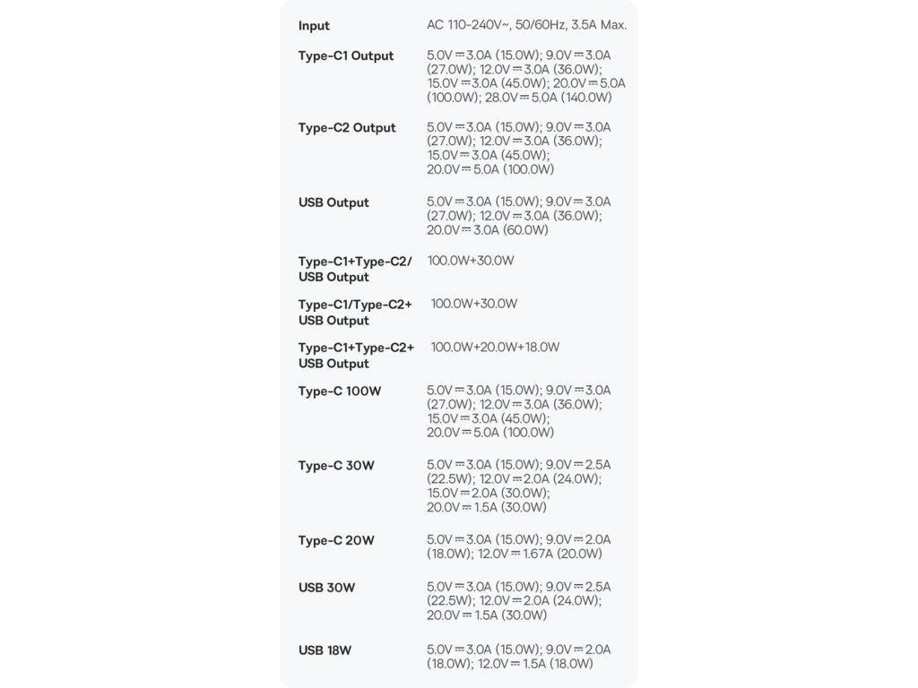 - Type-C1+Type-C2+USB: 100.0W+20.0W+18.0W