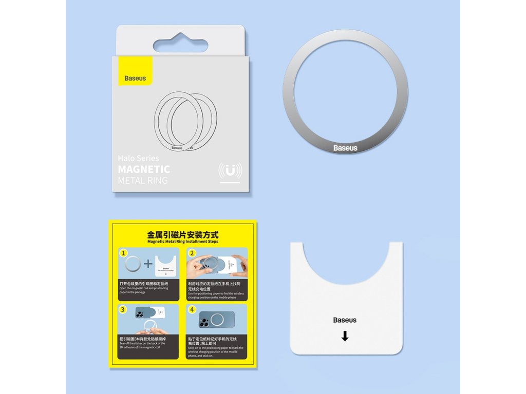 Baseus Halo je magnetický kroužek pro smartphony a pouzdra s pevnými zády. Je určen pro zařízení, která mají funkci bezdrátového nabíjení Qi (lze montovat i na telefon bez bezdrátového nabíjení, ale pak bude kroužek sloužit pouze pro příslušenství bez nabíjení). Kroužek je vybaven pro rychlou instalaci - stačí ho jen nalepit na pevný a rovný povrch. Nezáleží jestli přímo na telefon, nebo na kryt s pevnými zády. Tloušťka kroužku nepřesahuje 0,4 mm, takže nijak nenarušuje tenkost telefonu či krytu.