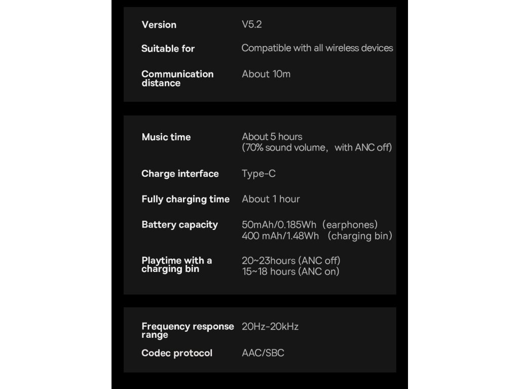 - Doba přehrávání hudby: až 5 hodin (70% hlasitosti, ANC vypnuto)