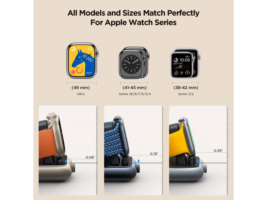 - Kompatibilní s různými modely hodinek Apple Watch. Díky možnosti nastavení výšky nabíječka zajišťuje stabilní a efektivní nabíjení.