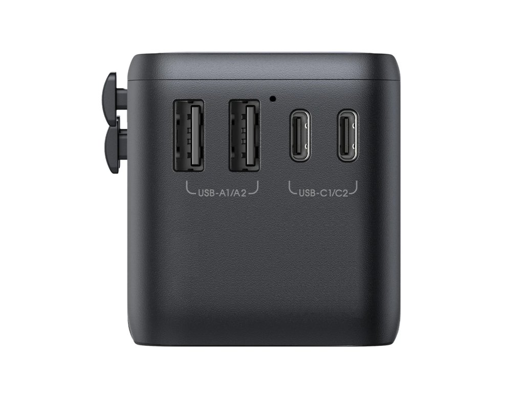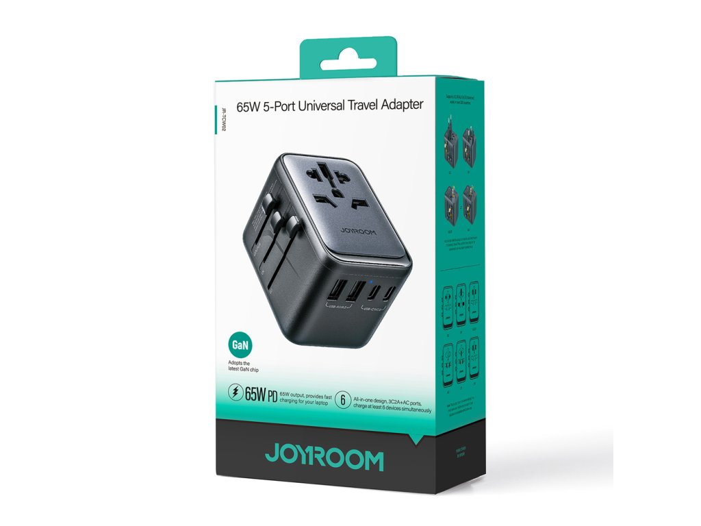Cestovní adaptér Joyroom JR-TCW02 65W umožňuje současné nabíjení až šesti zařízení. Tři porty USB-C, dva porty USB-A a zásuvka AC poskytují obrovskou univerzálnost. Díky tomu můžete nabíjet nejen mobilní zařízení, ale i menší domácí spotřebiče, jako jsou vysoušeče vlasů nebo ruční napařovače.