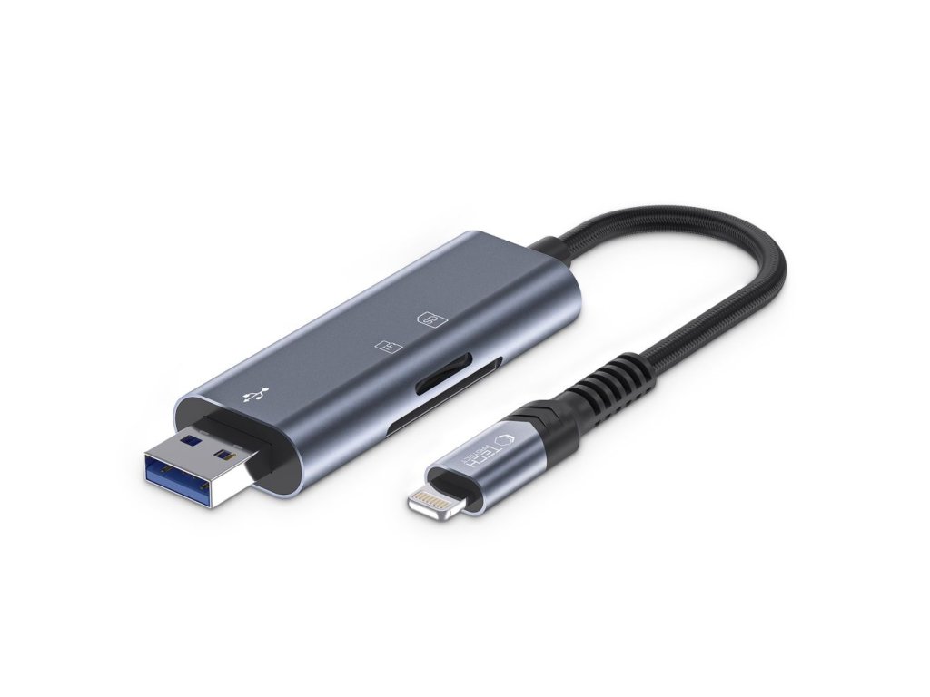 Čtečka karet Tech-Protect UltraBoost Lightning / USB-A – podpora MicroSD, SDHC, SDXC, MMC Micro, RS-Micro – šedá