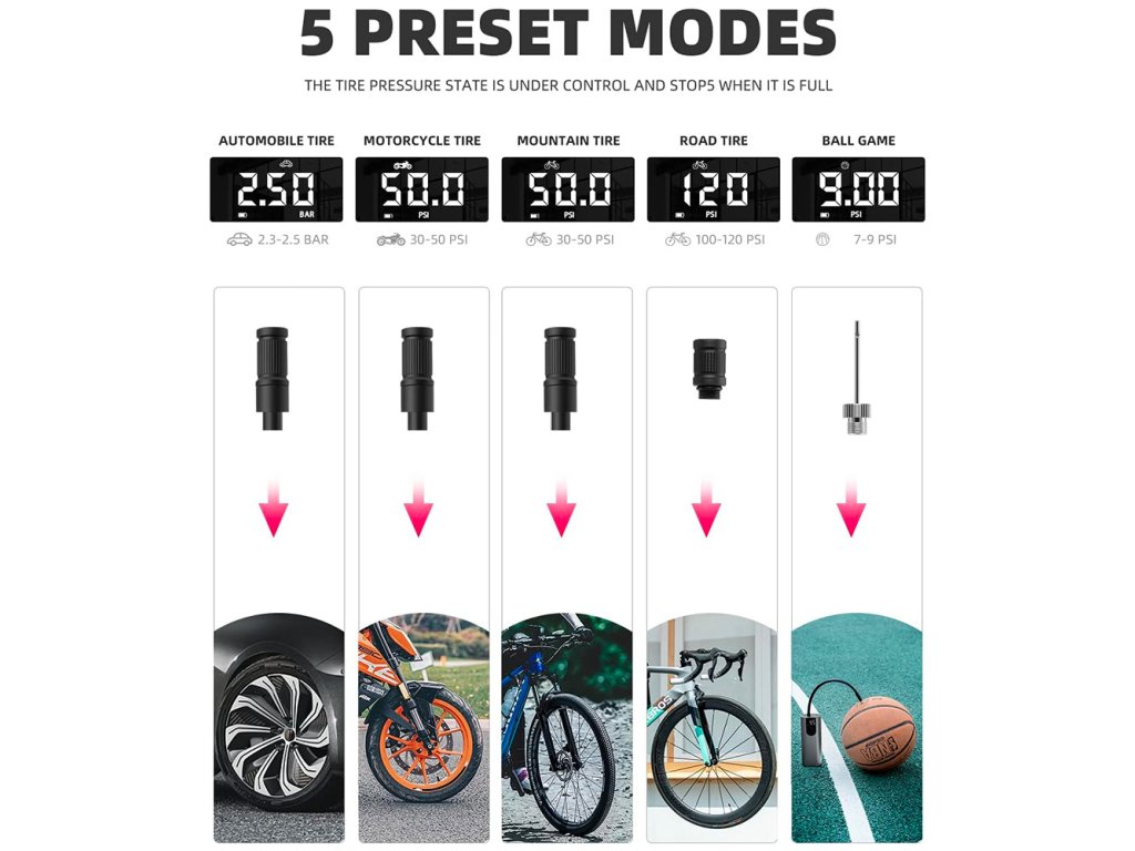 - Má 5 různých možností nafukování. Umožňuje nafouknutí kola, motocyklu, míče nebo dokonce auta.