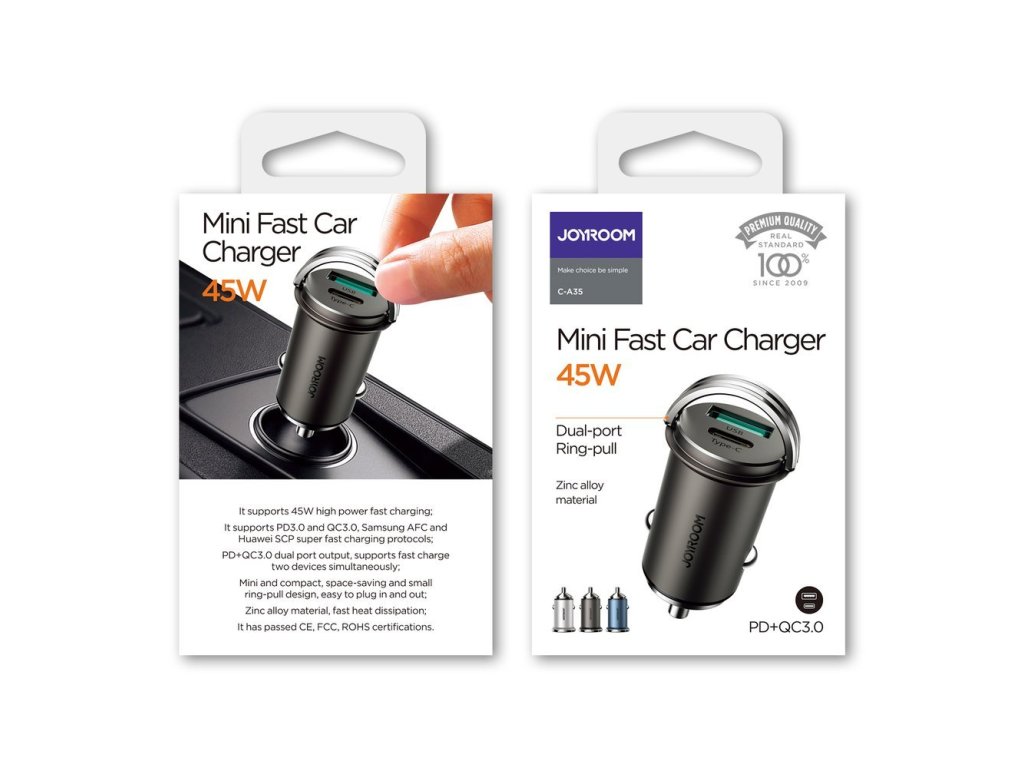JOYROOM C-A35 Duální Mini autonabíječka USB+USB-C PD QC3.0 s výkonem 45W, tmavě šedá