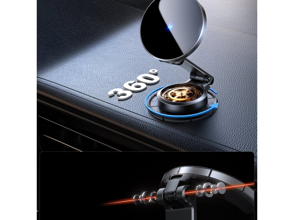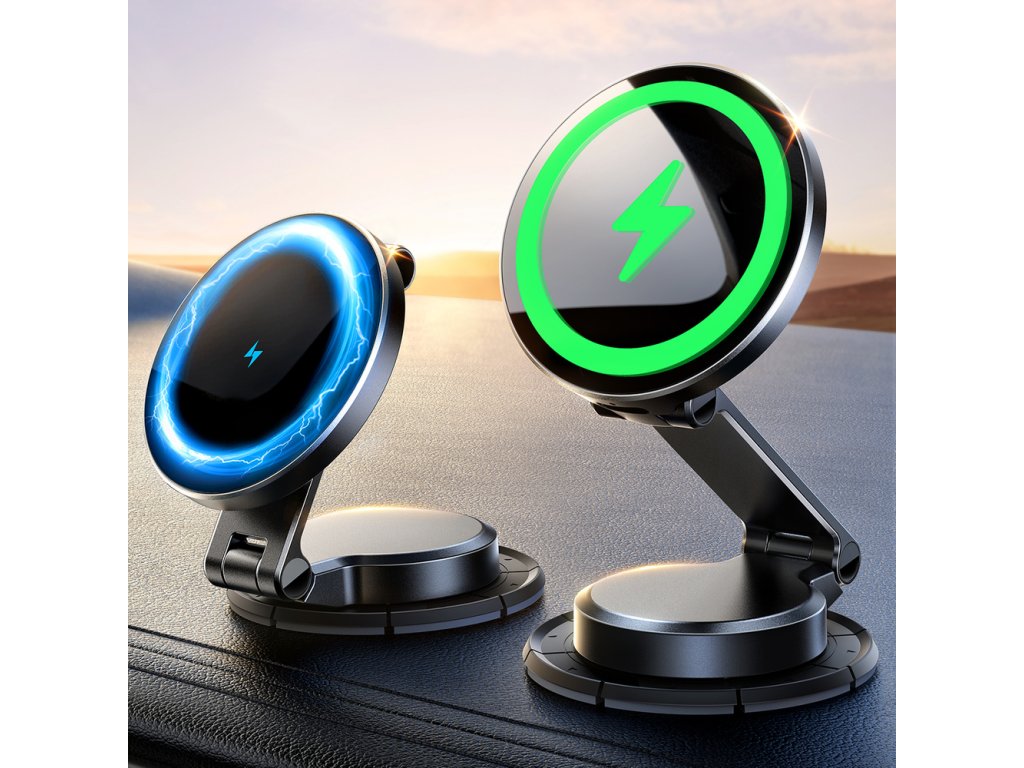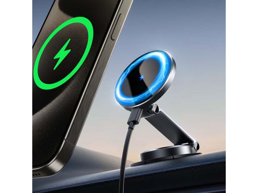 Vestavěná nabíječka podporuje výkon až 15 W, což zajišťuje rychlé a efektivní dobití vašeho zařízení. Magnetické zarovnání vám usnadní použití – jednoduše přiložíte telefon a o zbytek se postará držák.