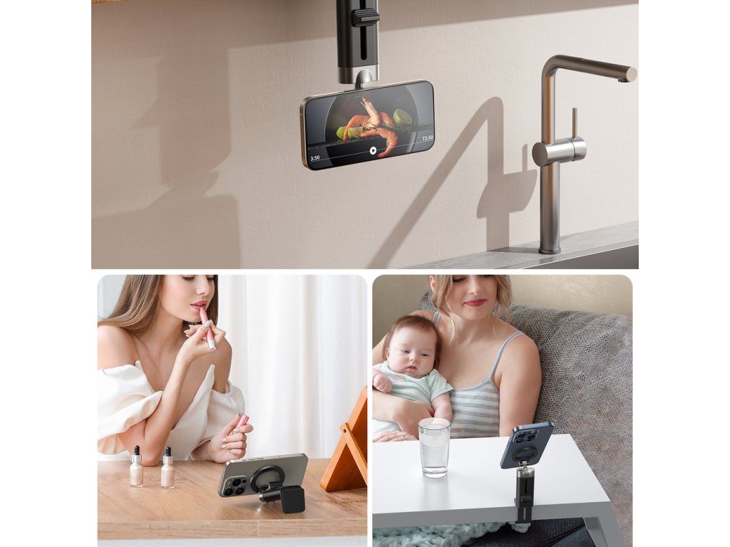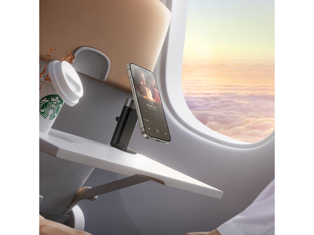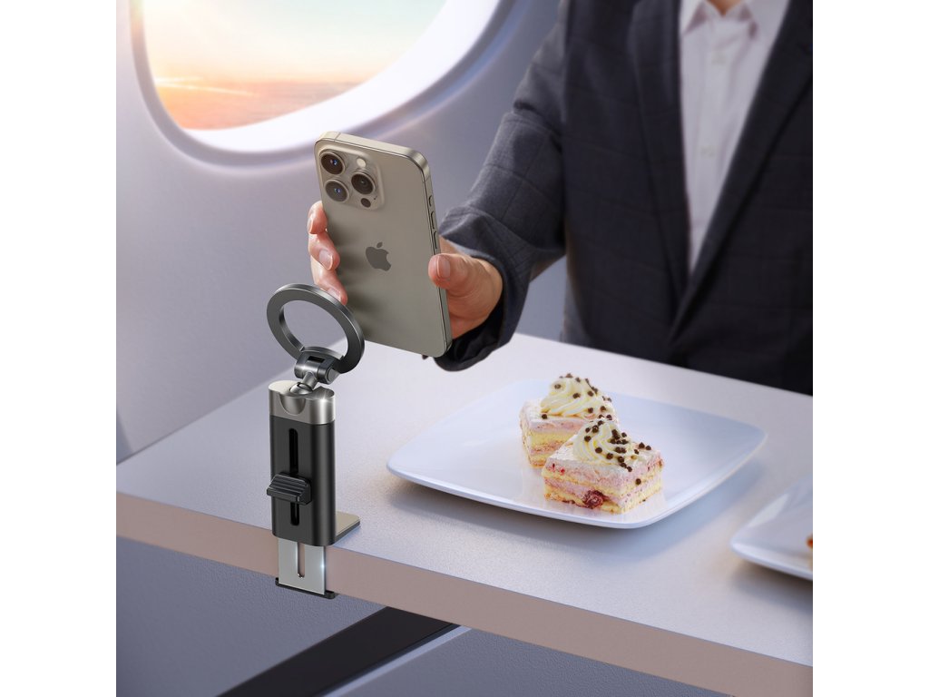 Flexibilní upínací základna umožňuje připevnění stojanu k různým povrchům. Ať už jste v letadle, kuchyni nebo hotelu – telefon bude vždy stabilně uchycen.