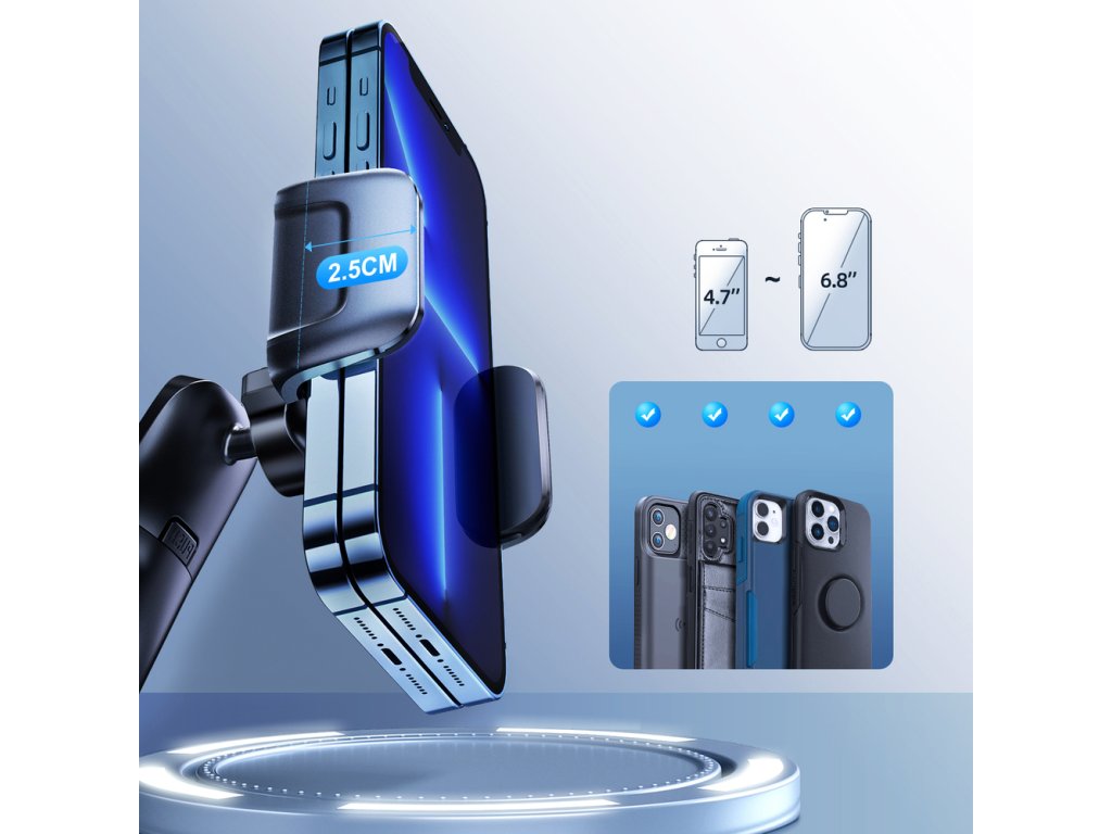 Otočná hlavice umožňuje nastavit držák do libovolné pozice – svisle, vodorovně nebo šikmo. Přizpůsobíte si tak polohu telefonu přesně podle potřeby.