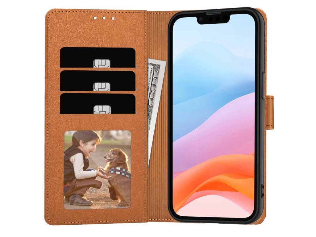 Elegantní a praktické pouzdro s klopou z ekologické PU kůže v hnedé barvě. Poskytuje vašemu iPhonu 16e ochranu a zároveň styl. Vnitřní rám z TPU absorbuje nárazy a magnetická klopa zajišťuje bezpečné uzavření. Uvnitř najdete sloty pro karty a hotovost a pouzdro lze použít také jako stojánek pro sledování videí.