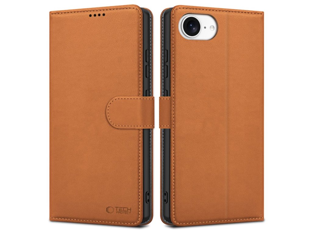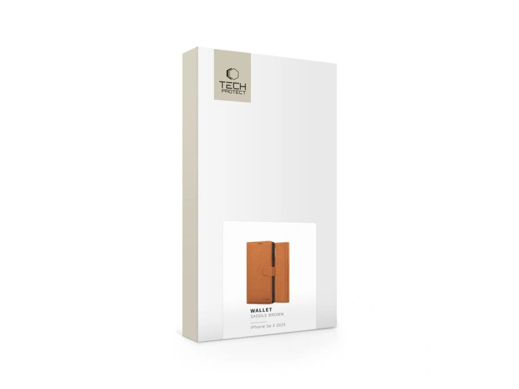 - 1× pouzdro s klopou Tech‑Protect Wallet pro iPhone 16e – hnedá kuže.