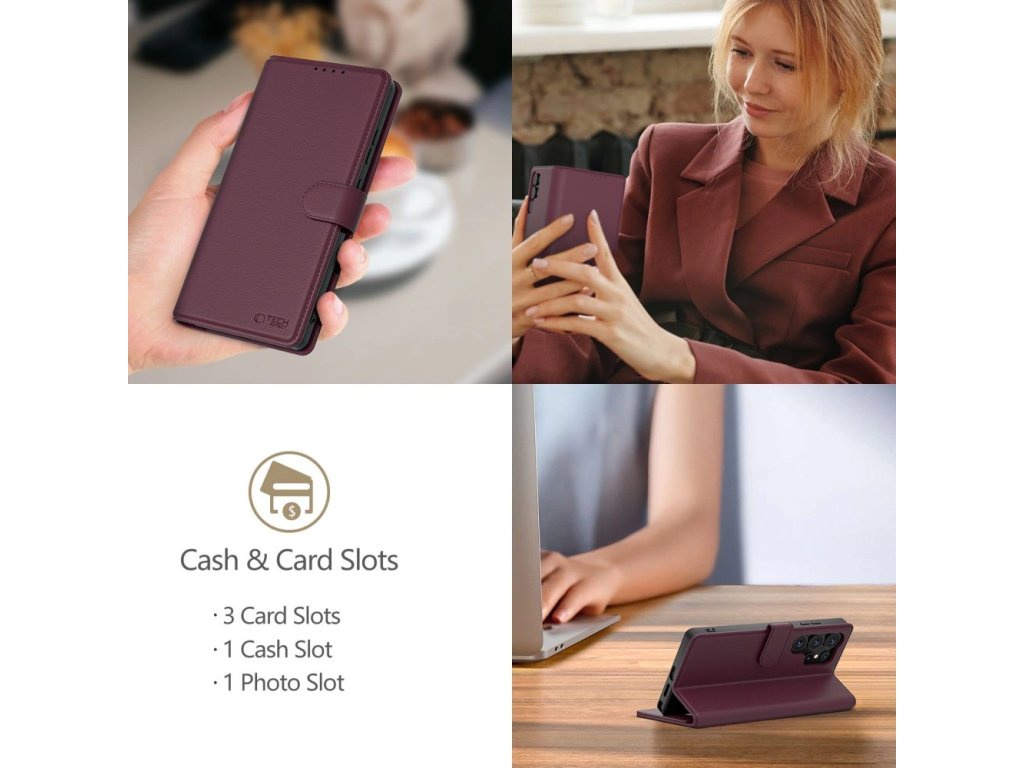 Elegantní pouzdro typu peněženka v odstínu mulberry kombinuje styl a praktičnost. Vyrobeno z ekologické PU kůže a pružného TPU rámu, poskytuje spolehlivou ochranu telefonu i pohodlné používání díky funkci stojánku a vnitřním kapsám na karty a hotovost.