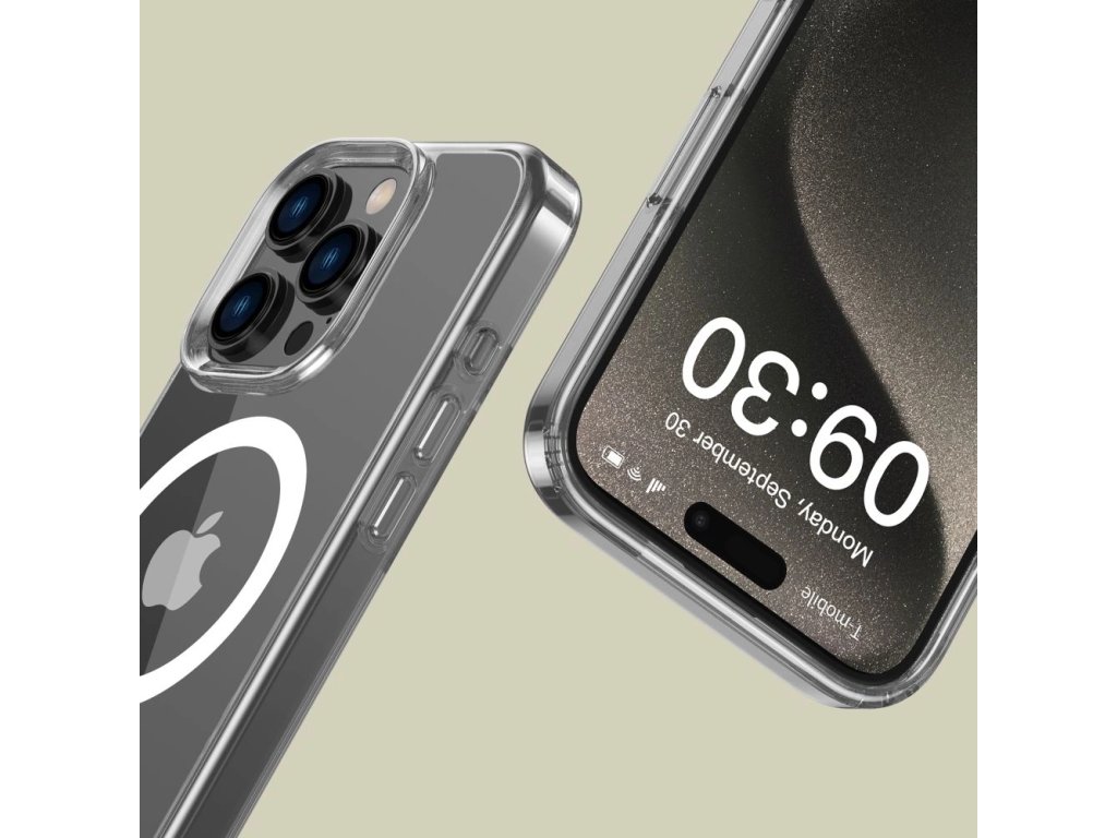 Klasický, jednolitý kryt Flexair Hybrid Magsafe od Tech-Protect s průhledným provedením, vytvořený s cílem zvýraznit linie a originální siluetu zařízení.