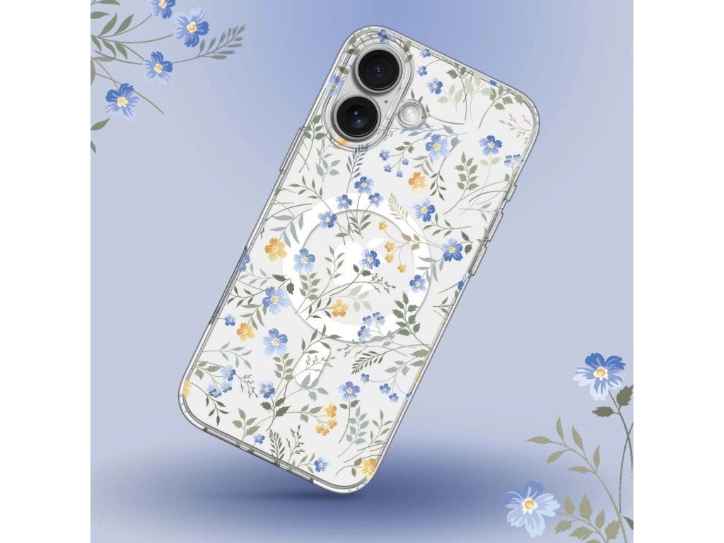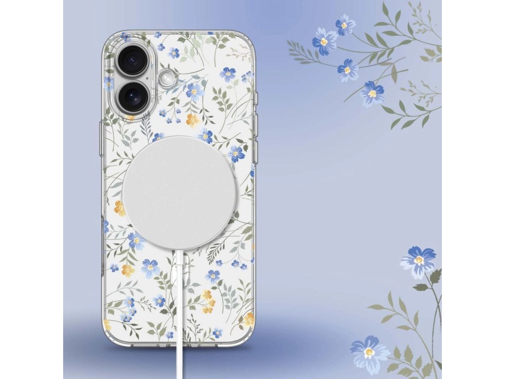 Lehký pružný kryt z TPU s integrovaným MagSafe kroužkem a jemným motivem jarních květin. Kombinuje spolehlivou ochranu před pády a škrábanci s atraktivním designem, přičem zachovává štíhlý profil telefonu.