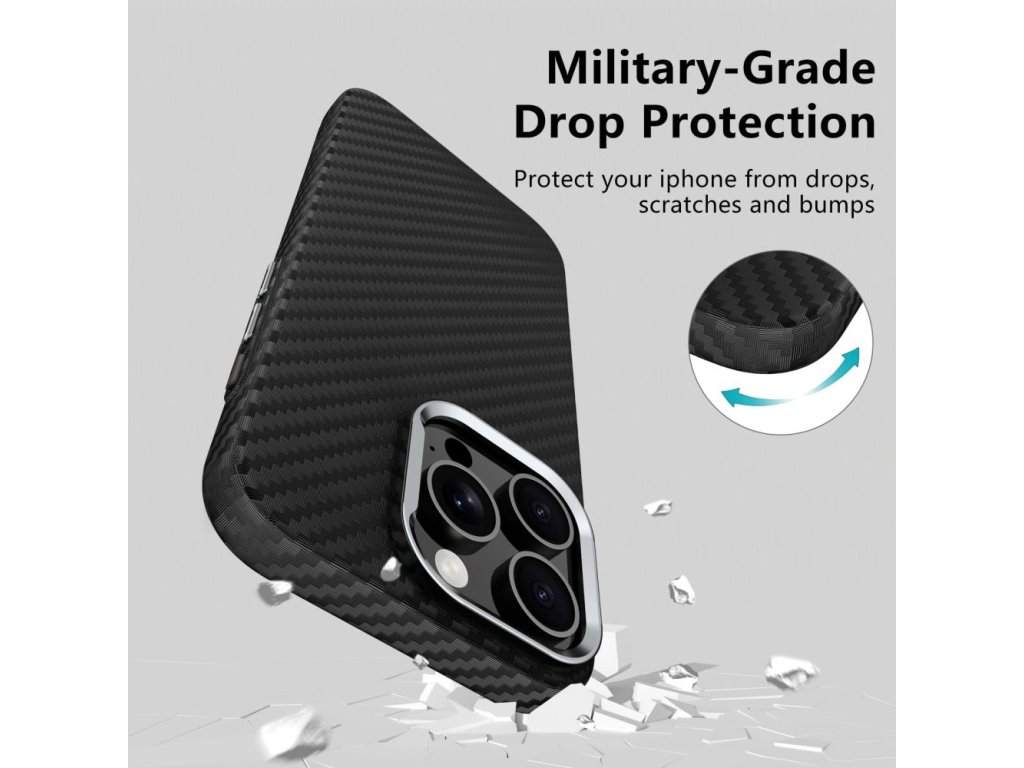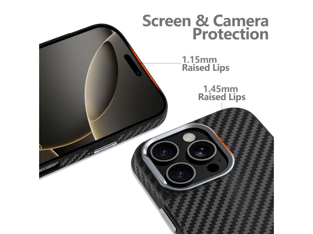 Toto prémiové krytí kombinuje ochranný polykarbonátový rám s elegantním uhlíkovým (carbon) vzorem a integrovaným kovovým kroužkem pro MagSafe. Lehký ale pevny materiál chrání telefon před poškrábáním a nárazy, zatímco texturovaný povrch zvýšuje bezpečný úchop. Integrovaný kovový kroužek slouží jako stojánek a také podporuje pohodlné držení.