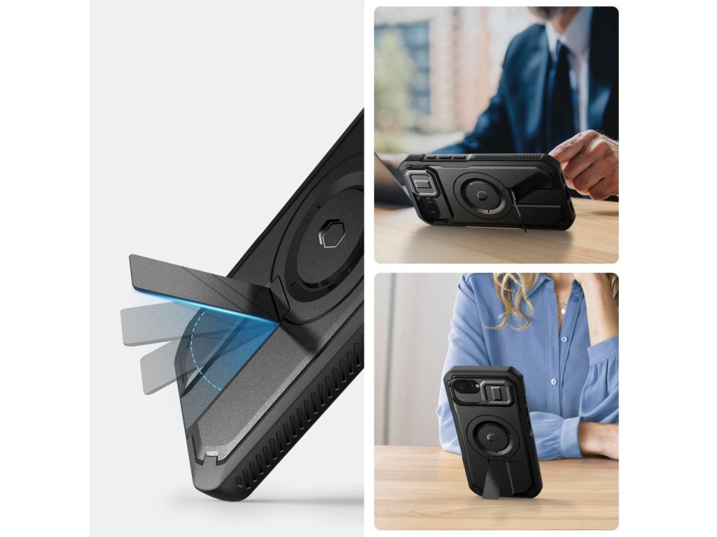 Robustní pouzdro s kevlarem inspirovaným designem a integrovaným MagSafe kroužkem pro bezpečné přichycení příslušenství. Hybridní konstrukce kombinuje odolný polykarbonát s pružným TPU, takže telefon spolehlivě chrání, a přesto zůstává lehké.