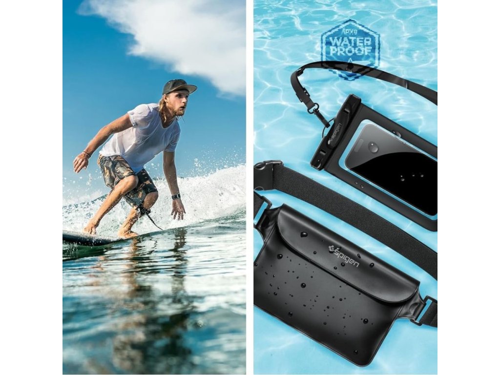 Spigen A620 je univerzální vodotěsné pouzdro na mobilní zařízení, klíče, bankovky a další zařízení a doplňky, které potřebujete uchránit před vniknutí vody. Zajišťuje se třemi zipovými uzávěry, aby bylo možné co nejbezpečněji zajistit předměty uvnitř. Konstrukce pouzdra Spigen A620 je ideální pro situace, jako je jízda na kajaku, kanoe, raftu, rybaření či pobyt na pláži. Celá brašna má rozměry 22x15 cm, zatímco vnitřní rozměry jsou přibližně 20x12 cm. Do pouzdra tak schováte nejcennější věci, které si s sebou k vodě potřebujete vzít.