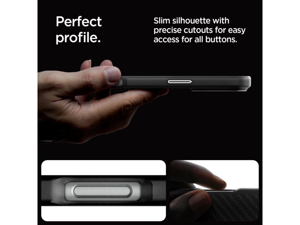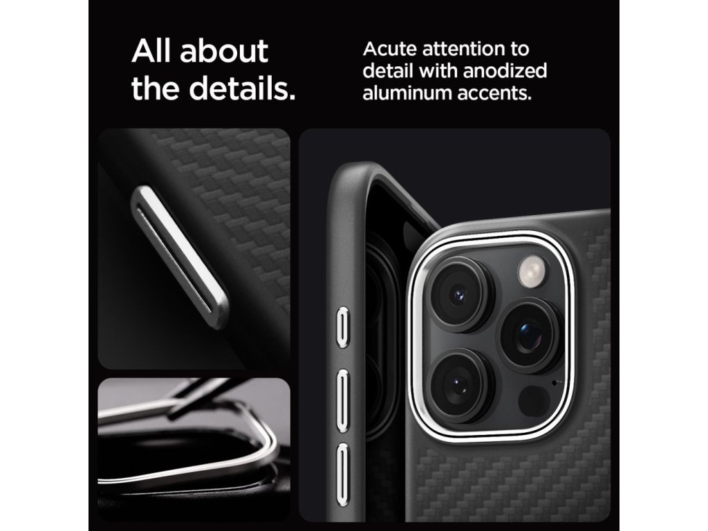 Spigen Enzo Aramid MagSafe pouzdro pro iPhone 16 Pro Max – černé a stříbrné