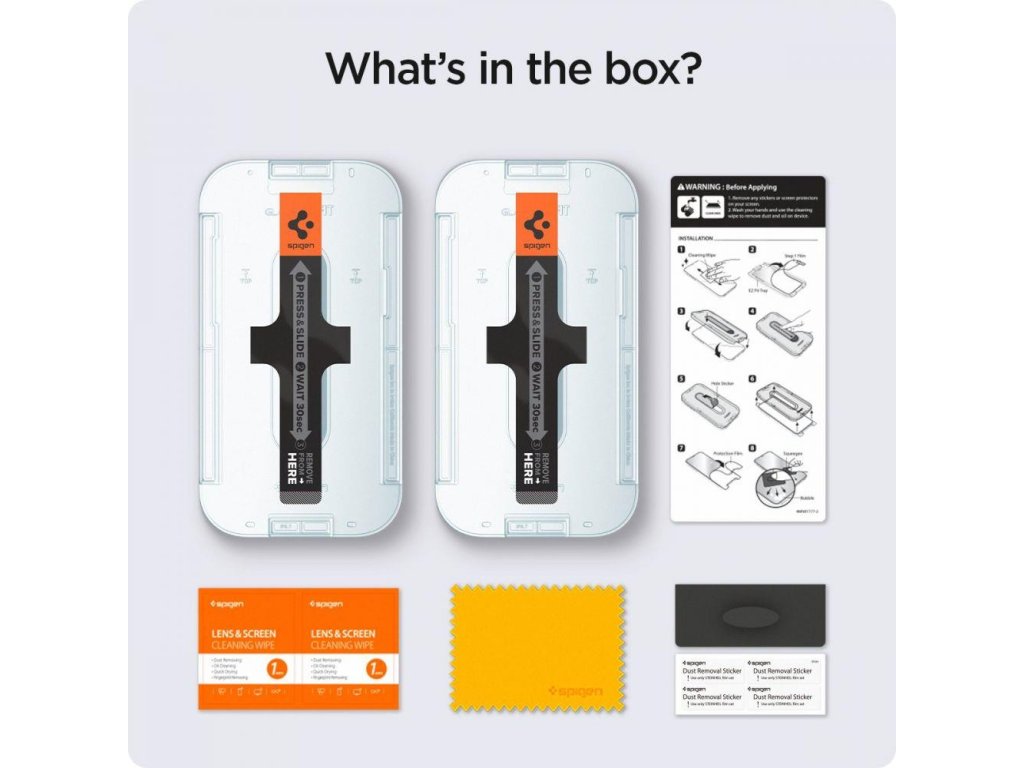 - Skla jsou kompatibilní se všemi pouzdry Spigen (** Poznámka: Není kompatibilní se Spigen Thin Fit 360 / Ultra Hybrid 360 a podobnými 360° kryty)