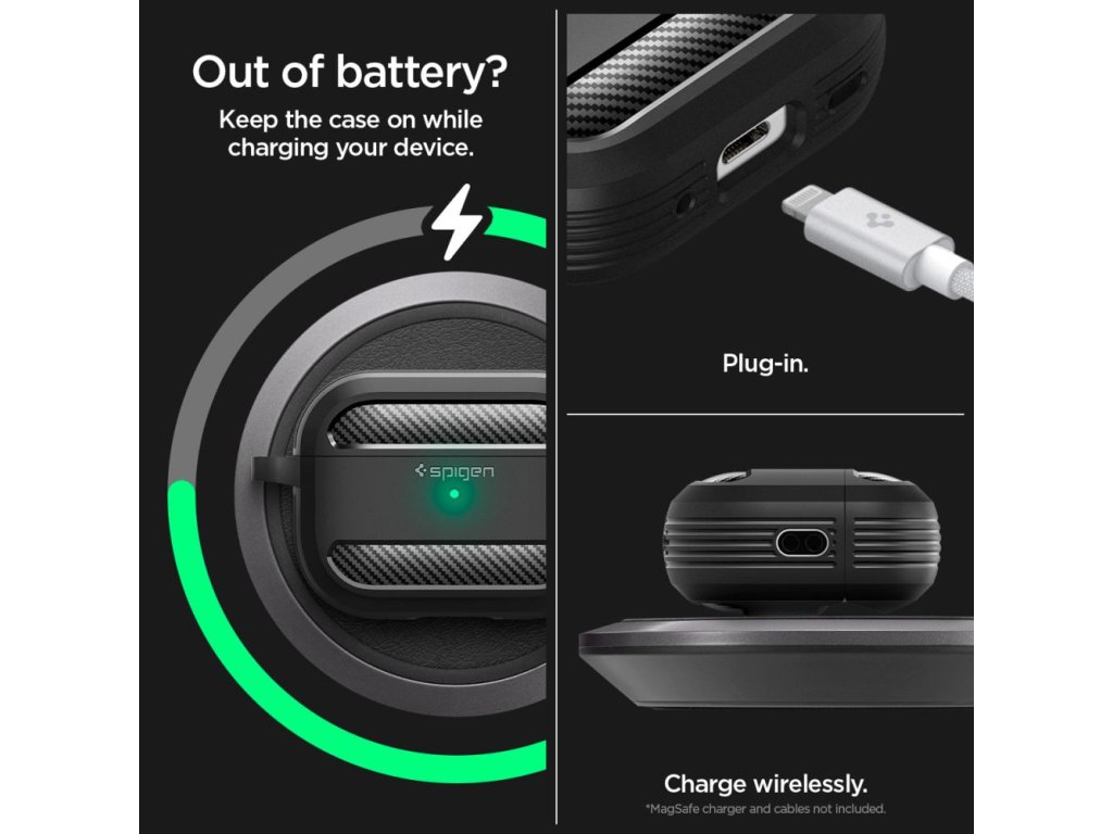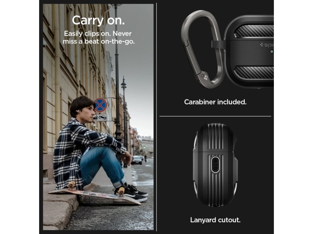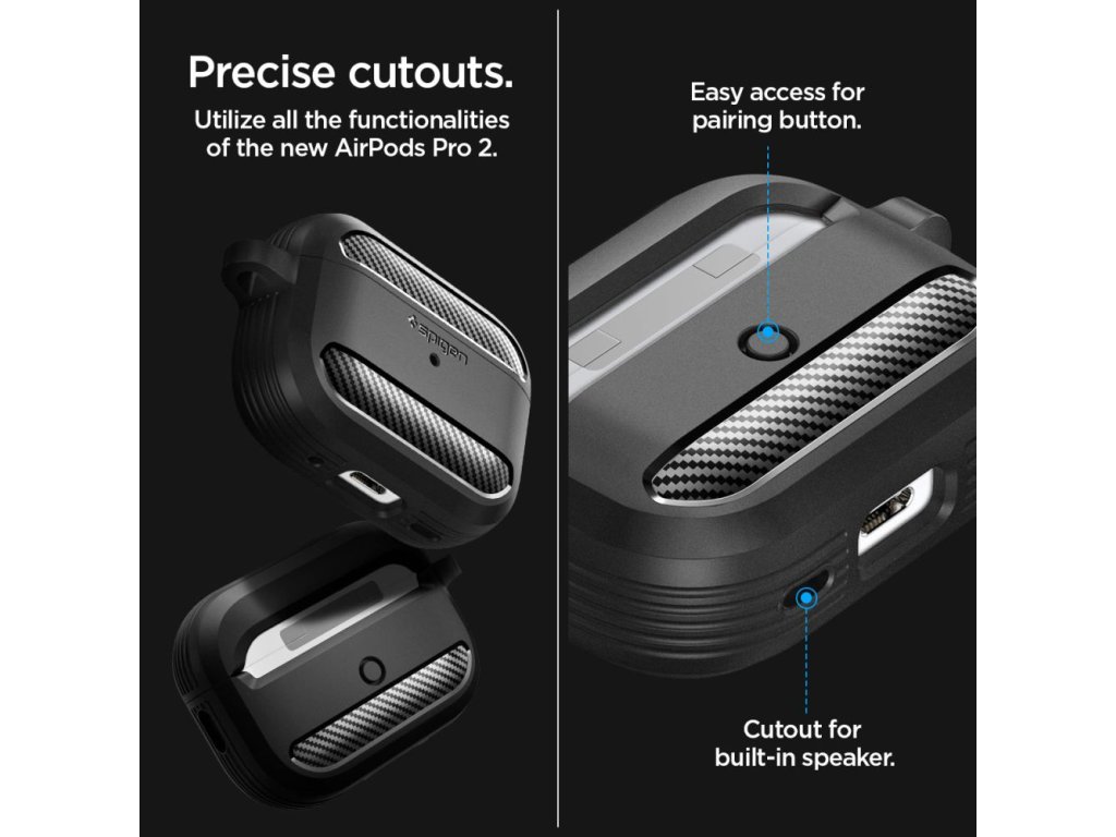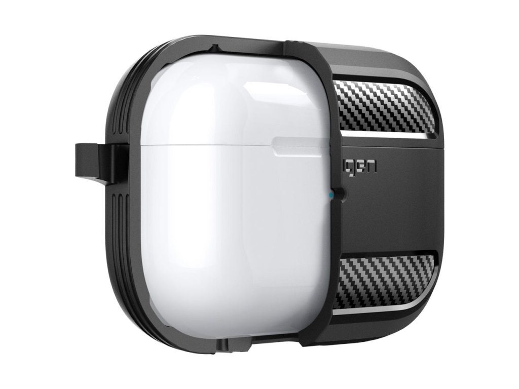 Řada Spigen Rugged Armor se rozrostla i o pouzdra pro nejprodávanější sluchátka na světě, Apple AirPods. Originální pouzdro Rugged Armor je tradičně vyvedeno v tmavé barvě s matným povrchem a dekorem karbon-kevlaru. Poskytuje pokročilou ochranu sluchátek proti poškození a poškrábání. Charakteristický vzhled uhlíkových vláken a matná povrchová úprava dodávají pouzdru nadčasový vzhled a činí z něj elegantní doplněk sluchátek.