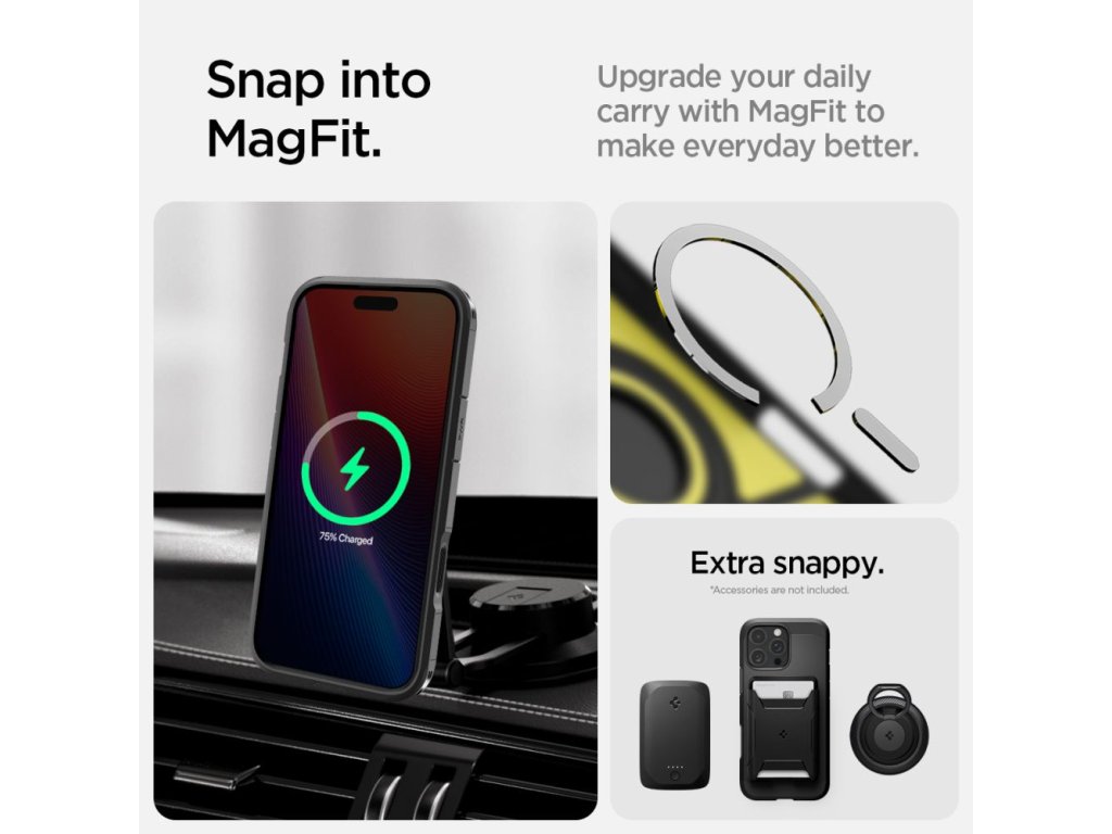 Spigen Tough Armor „T” Mag je vylepšená verze svého předchůdce. Pouzdro je vybaveno magnetickým kroužkem kompatibilním se systémem MagSafe pro uchycení a bezdrátové nabíjení, což zajišťuje rychlé a snadné využití technologií Apple.