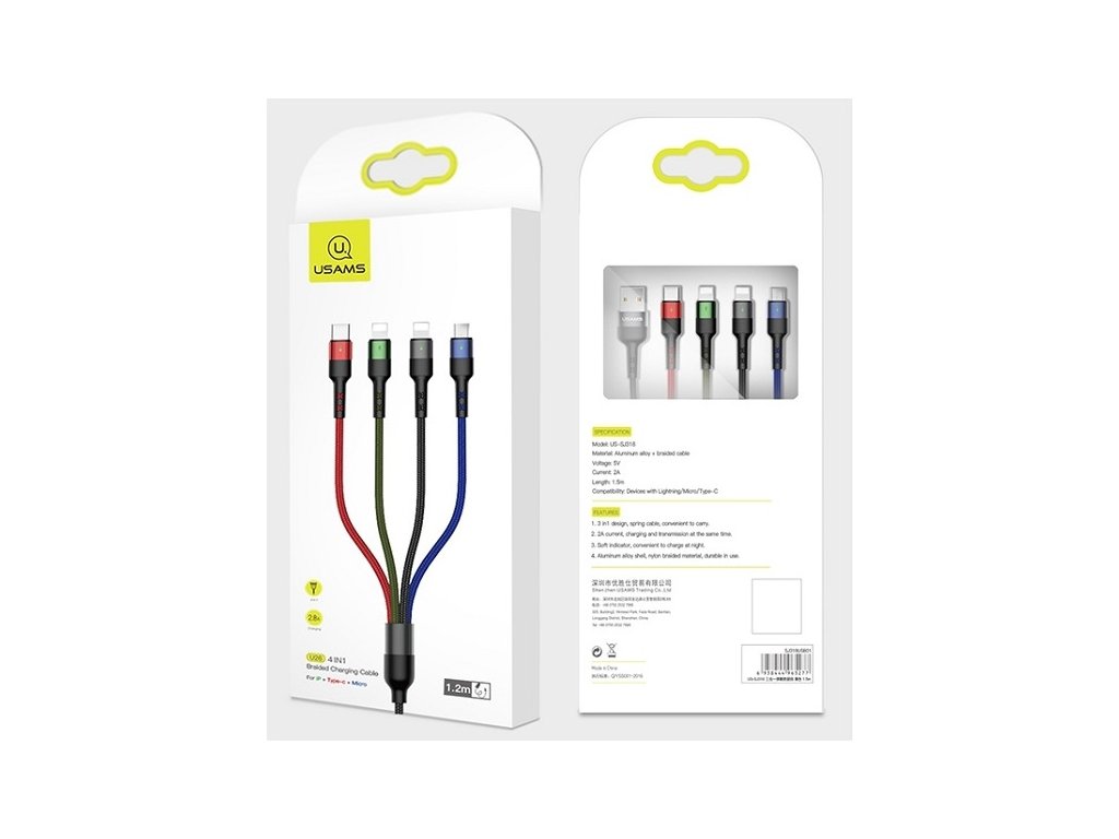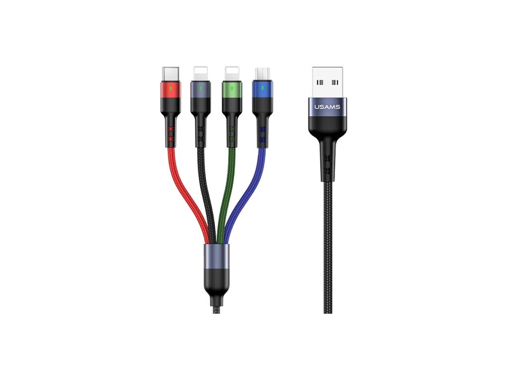 USAMS U26 US-SJ411 je univerzální 4v1 nabíjecí kabel s opletem, ideální pro ty, kteří potřebují nabíjet více zařízení najednou. Nabízí čtyři různé konektory – 2× Lightning, USB-C a microUSB – a umožňuje nabíjet až čtyři zařízení současně.