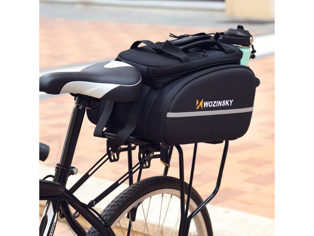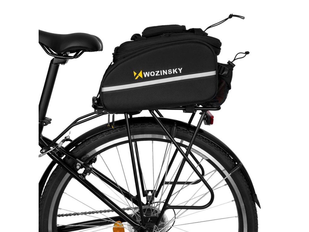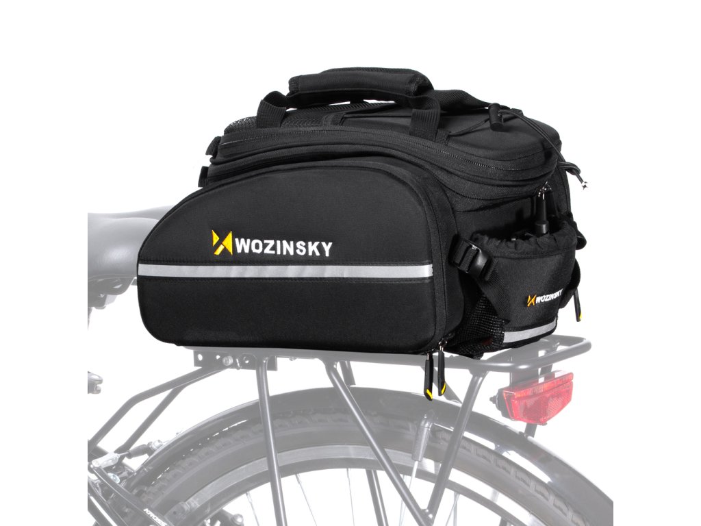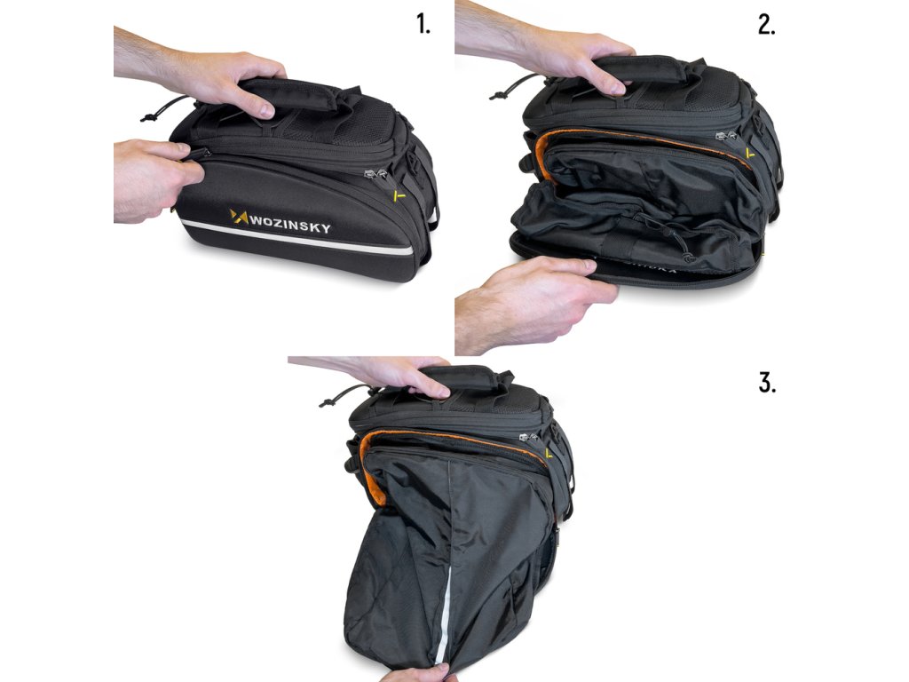 Cyklistická taška na nosič Wozinsky WBB19BK je jednou z nejfunkčnějších tašek v naší nabídce. Obsahuje mnoho praktických řešení: rozkládací, velké cyklistické brašny, pláštěnku, pohodlné vnitřní přepážky, ramenní popruh. Podle potřeby můžete rychle a pohodlně zvětšit její užitnou plochu. Je to skvělý doplněk pro kratší i delší výlety. Cyklistická taška na nosič je také snadná na montáž a demontáž, takže ji můžete rychle vzít s sebou.